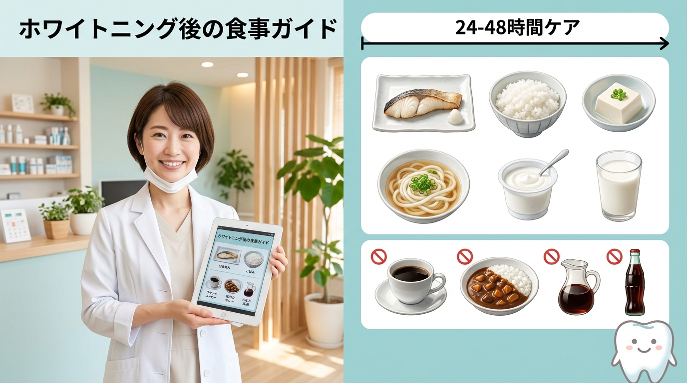 ホワイトニング後は、着色を避けるために特定の食材を選ぶことが推奨されています。