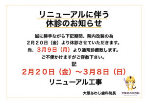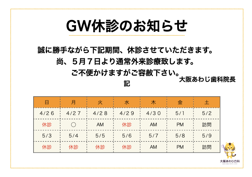 GW休診のお知らせ 2026 4/29 お知らせ 2026年4月29日 誠に勝手ながら下記の期間休診させていただきます。 尚、5月7日より通常診療させていただきます。 ご不便をおかけしますがご容赦下さい。 大阪あわじ歯科院長 お知らせ よかったらシェアしてね! URLをコピーしました! URLをコピーしました! 【保存版】ホワイトニング後の食事レシピ!制限の注意点とメニュー 関連記事 リニューアル工事のお知らせ 2026年2月27日